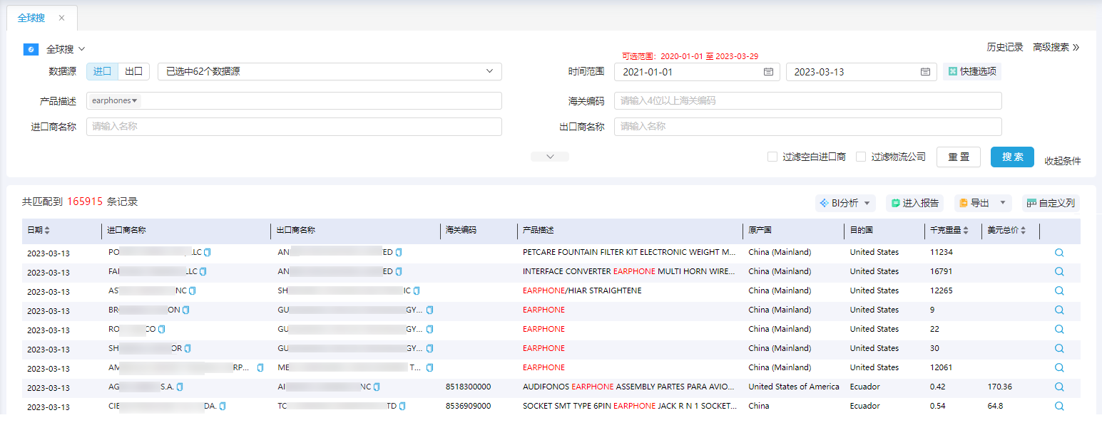 3. 结合该核心产品的特点从K8凯发(中国)外贸通中,找出采购earphones的买家及其交易记录,顺利获得分析采购动态、交易趋势、供应链,竞品特点等等,有针对性的去挖优质潜客 。